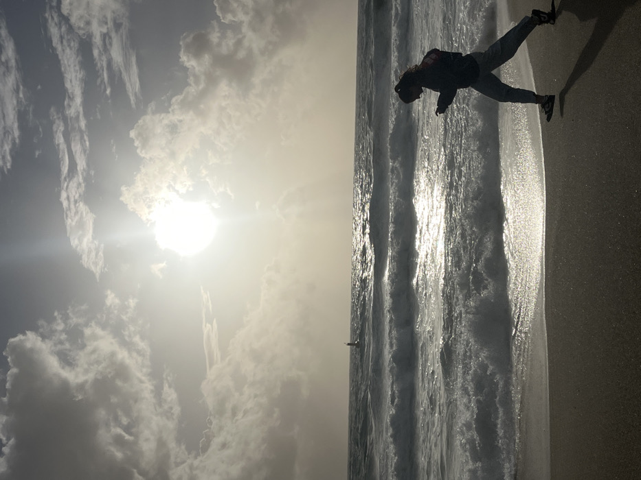 The image captures a coastal scene in Alanya, Turkey, under a bright, partly cloudy sky. The sun, an intense source of light with prominent lens flare, is situated in the upper-left quadrant, partially veiled by scattered light grey clouds. The Mediterranean Sea dominates the mid-ground, featuring multiple lines of white-crested waves breaking towards the shore, with the water surface intensely reflecting the sunlight. A dark, cylindrical buoy, topped with a lighter element, is visible in the distant water near the horizon. The foreground consists of dark, wet sand, marked by the receding waves. A single individual, appearing female, is silhouetted against the illuminated sea and sky, positioned in the lower-right and mid-ground. She has dark, long hair and is dressed in a dark jacket, light-colored pants, and dark athletic shoes. The individual is in mid-stride, moving from the right side of the frame towards the left along the water's edge, with her left foot elevated. Her attention is directed downward at a small, dark, rectangular object held in both hands, consistent with a smartphone.