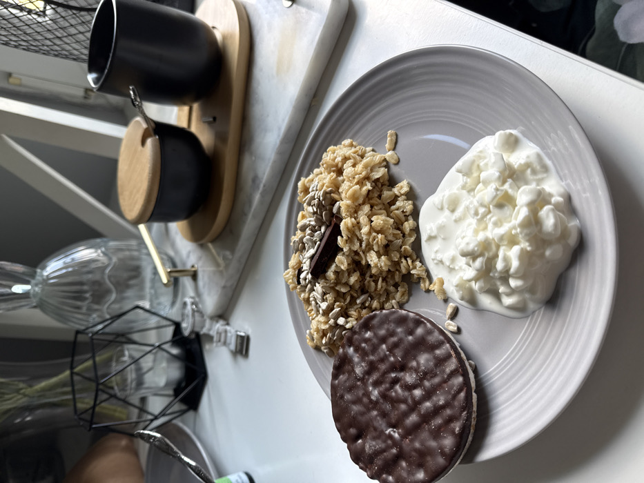 The scene depicts a tabletop arrangement in Tarnów, Poland, featuring a breakfast or snack. In the immediate foreground, a grey ceramic plate holds three distinct food items: a round, chocolate-coated biscuit with a textured surface on the left; a pile of crunchy cereal or granola topped with sunflower seeds and a small segment of dark chocolate in the upper right; and a dollop of white cottage cheese with small curds in the lower right, accompanied by a few scattered sunflower seeds. Beyond the plate, on a white table surface, a person's left forearm and hand are partially visible on the far left. Adjacent to this, a silver-colored spoon or fork rests on a light-colored surface, and a small green-capped bottle is partially visible. Further back, two wristwatches with silver metal bands are placed on the table. Towards the right, a white marble serving board with grey veining supports a light-brown, oval wooden tray. On this wooden tray, a small black ceramic bowl with a wooden lid and a tiny spoon rests alongside a black ceramic mug. In the background, a clear, ribbed glass vase containing thin dried plant stalks is visible, positioned next to a black geometric wire-frame candle holder containing a white tealight. The setting is illuminated by natural light, presumably from a window to the right, casting soft shadows.