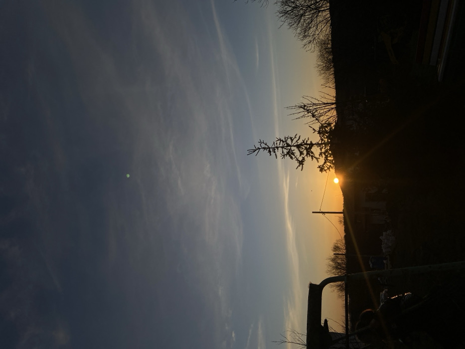 The image depicts an outdoor sunset scene in Arbanassi, Bulgaria. The sun is visible as a bright orange orb positioned low on the horizon towards the center-right, casting strong lens flares and silhouetting the foreground and midground elements. The sky exhibits a gradient from dark blue at the top, transitioning to lighter blues and oranges near the horizon, with scattered wispy clouds. A distinct green lens flare is present in the upper sky. In the foreground, a heavily silhouetted human figure, likely a child, is partially visible on the far left, appearing to be seated within a large, arc-shaped metal frame, possibly part of a swing set or playground equipment. To the right of this frame, a slender, conical conifer tree stands prominently. Further right, a utility pole with visible wires crosses the scene. Beyond the utility pole and conifer, a collection of bare deciduous trees and bushes creates a dark silhouette against the sunset glow. In the lower right corner, a portion of a multi-colored bench or seating area is visible. The background consists of a dark, rolling landscape, possibly indicating distant hills or buildings obscured by shadow. No specific interactions or dynamic actions are discernable.