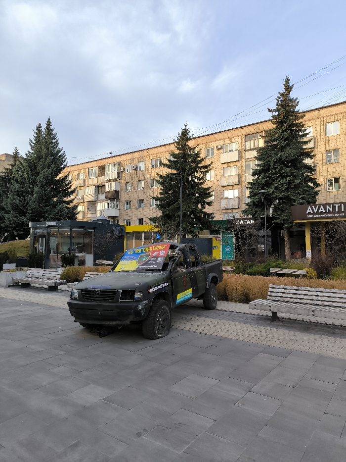 - "The image depicts an outdoor urban scene in Rivne, Ukraine, featuring a heavily damaged, dark green or camouflaged pickup truck positioned on a paved pedestrian square" by FM-dWhzM2, licensed under CC BY 4.0