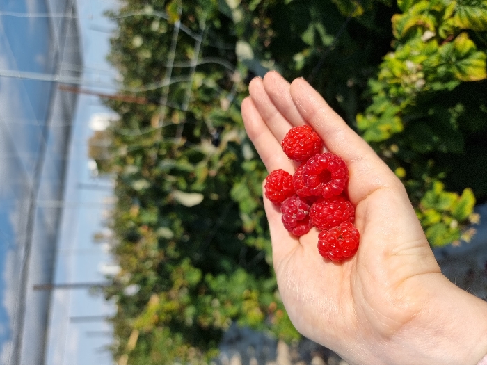 - "A light-skinned human left hand is presented in the foreground, palm upwards, holding a cluster of approximately eight to nine vivid red raspberries" by FM-Uq0Y63, licensed under CC BY 4.0