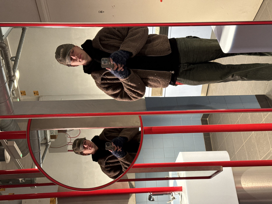 - "A person in a brown jacket, black sweater, green pants, and a patterned cap stands in a public restroom, taking a selfie in a large rectangular mirror with red trim" by FM-jCIl63, licensed under CC BY 4.0
