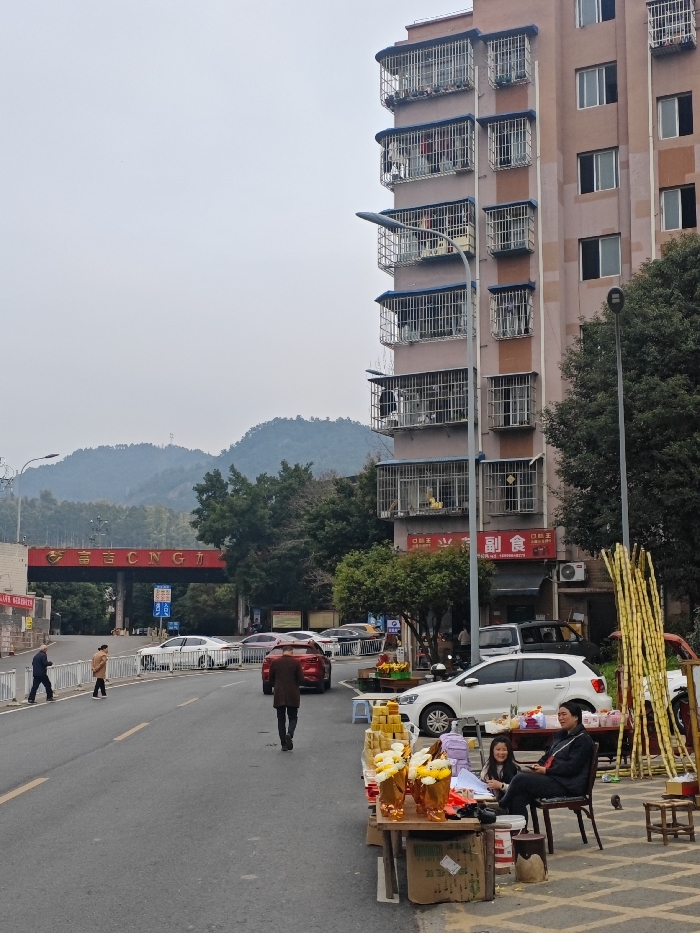 The image depicts a street scene in Bishan, China, under an overcast sky with a backdrop of forested hills. In the foreground, on the right, a makeshift vendor stand is set up on a sidewalk. An adult female, dressed in dark clothing, sits on a chair facing left, while a child, also in dark attire, sits facing forward to her right, smiling. The stand displays various items, including multiple clear jars containing a golden substance and other packaged goods. Bundles of tall, yellowish stalks, resembling sugarcane, are propped vertically near the stand. Several small stools and buckets are also visible. Adjacent to the vendor stand, a white hatchback car is parked on the street. Further down the street, a red sedan is parked, and a dark-coated individual with a hat walks away from the viewer in the road's center. To the left, two other individuals walk on or near the road, one in dark blue clothing and another in a light brown coat, both moving towards the left. The road itself is asphalt, curving slightly to the left, and is bordered by white barriers in the mid-ground. In the mid-background, a prominent red arched gate with the white characters "富吉 CNG" (Fuji CNG) is visible, indicating an entrance to a CNG station. Blue directional signage is posted near this gate, and several vehicles are parked beyond it. Dominating the right side of the image is a multi-story residential building with a light peach-colored facade. Multiple windows on each floor are enclosed with white security grilles, forming small, covered balconies where laundry is visible hanging on several levels. The ground floor of this building features a commercial sign with Chinese characters, including "副食" (groceries/non-staple food), and an external air conditioning unit. A streetlight extends from the building's facade towards the street. Trees line parts of the street and obscure the lower portions of the hills.