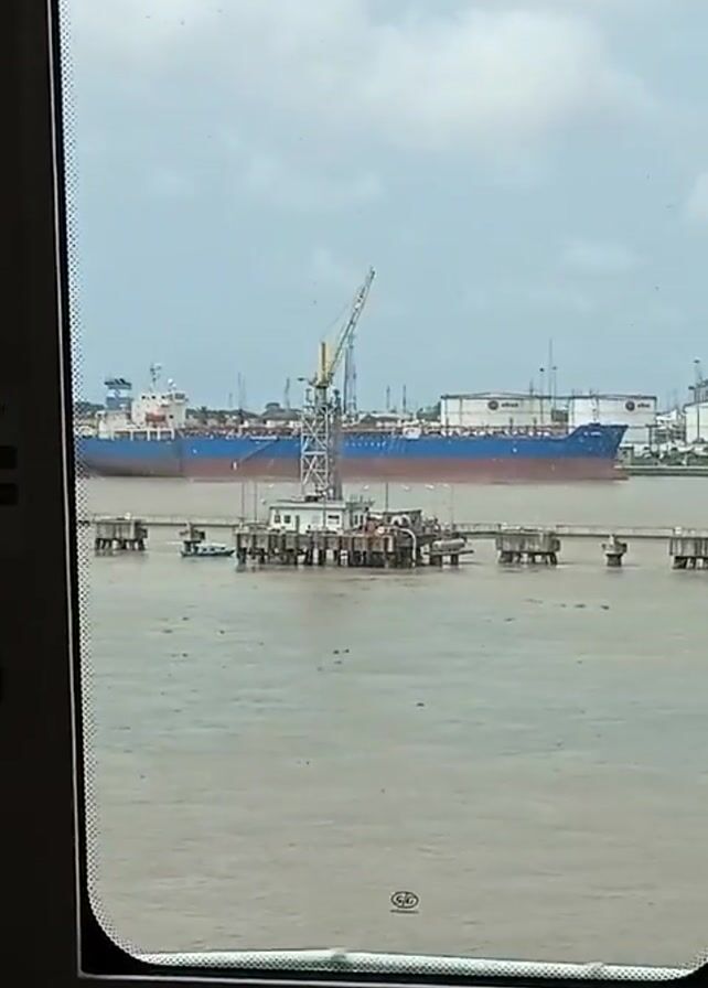 view from inside a vehicle, likely a train or a bus, looking out a window at a harbor. A large blue and red cargo ship is docked in the distance. A pier and a small building are in the foreground, along with some equipment. The water in the harbor is murky and brown. In the background, there are several large white storage tanks. The sky is partly cloudy. A sign with a button, some arrows, and the words "Passenger Door Open Button" are visible on the left side of the window.