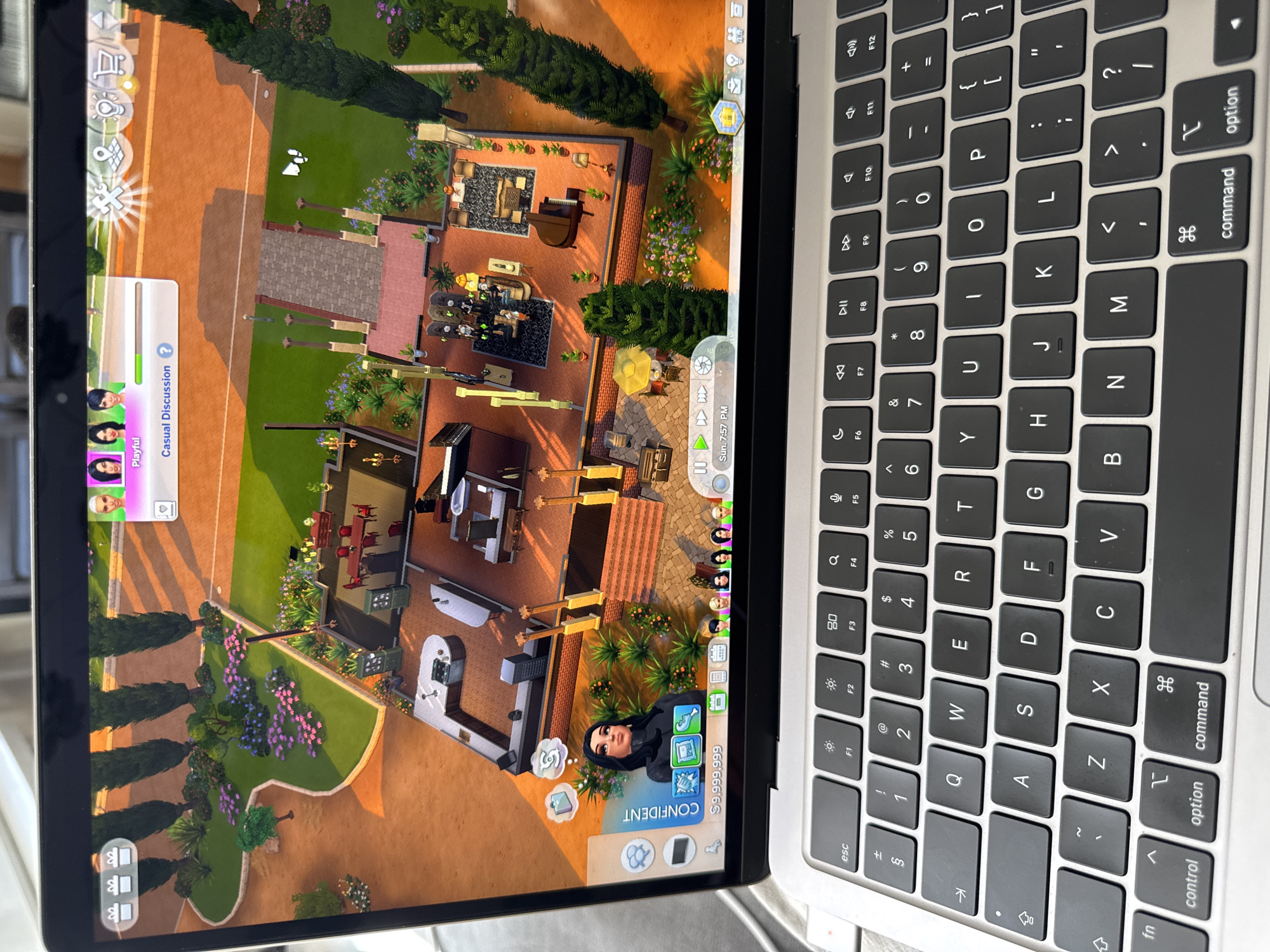 laptop displaying the game "The Sims 4". The keyboard is visible on the right side of the image, and the game screen fills the rest of the view. In the game, a sim is visible at the bottom right of the screen with a "confident" moodlet and $9,999,999. The game shows a bird's-eye view of a large house and its landscaping. The game displays also show that it is Sunday at 7:57 PM. The current interaction selected is "Casual Discussion". The location is indeterminate, as the game environment is fictional and there is no indication of Sofia, Bulgaria.