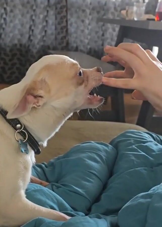 A medium, eye-level shot shows a small, tan and white chihuahua with a black collar and a blue tag growling with bared teeth at a hand that is held near its face