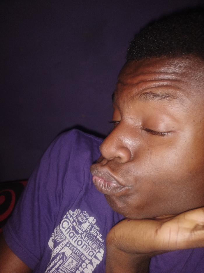 A person with dark skin and short, dark hair rests their chin on their hand, eyes closed. Their lips are pursed. They are wearing a purple T-shirt with white text and designs on the left side. The background is a solid, dark purple. The image is well-lit, highlighting the person's facial features and the details on their shirt.