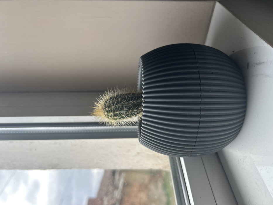 - "A small, green, cylindrical cactus, featuring dense yellow spines at its apex and white spines along its body, stands centered in a dark gray, vertically fluted, spherical pot" by FM-p9lyZ2, licensed under CC BY 4.0