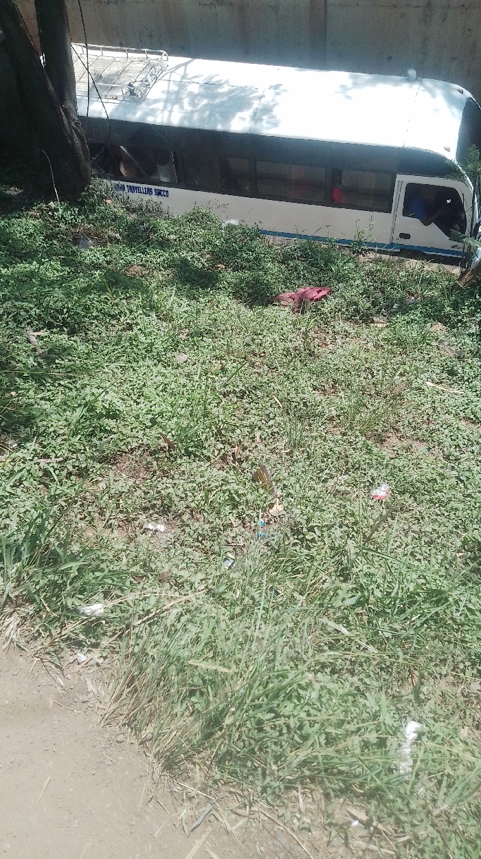 A white and blue commercial minibus, displaying "TRAVELLERS SACCO" text on its side, is depicted off-road in Nairobi, Kenya. The vehicle is severely tilted to its left (driver's side), with its front end partially obscured, resting against a thick tree trunk and a concrete or dirt embankment. A metallic roof rack is visible atop the bus. One individual wearing a blue shirt is observable within the driver's cabin. The immediate foreground consists of a densely vegetated, grassy slope containing sparse weeds and scattered refuse, including plastic items and a red fabric object. A bare dirt patch marks the lower left edge of the frame. Strong overhead sunlight casts distinct shadows. No other individuals or active interactions are visible in the scene.