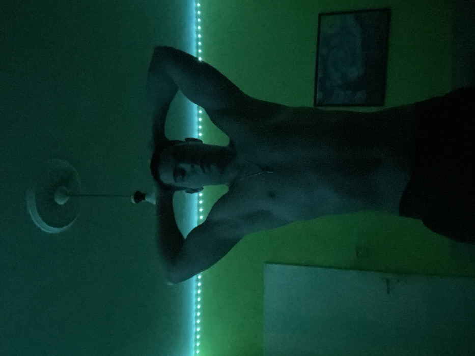 The image captures an indoor scene in Silistra, Bulgaria, bathed in a strong green light originating from LED strip lights positioned along the upper wall. A male individual, appearing to be a young adult, stands centrally, facing the camera directly. He is shirtless, with his bare torso visible from approximately the mid-thighs upward. His arms are bent, with both hands positioned behind his head. A thin metal chain with a small pendant hangs around his neck. The subject's face is largely obscured by shadow, and his eyes appear to be directed downward. The background consists of a green-painted wall. To the left of the subject, a white rectangular panel, possibly a closed door, is partially visible. To the right, a dark-framed picture with an indistinct image hangs on the wall. A white circular ceiling fixture with a central drop pendant is visible on the ceiling. The overall environment is dimly lit, with the green illumination dominating the scene.