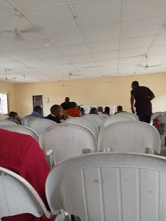The scene depicts an indoor gathering within a large, unadorned room in the city of Port Harcourt, Rivers, Nigeria