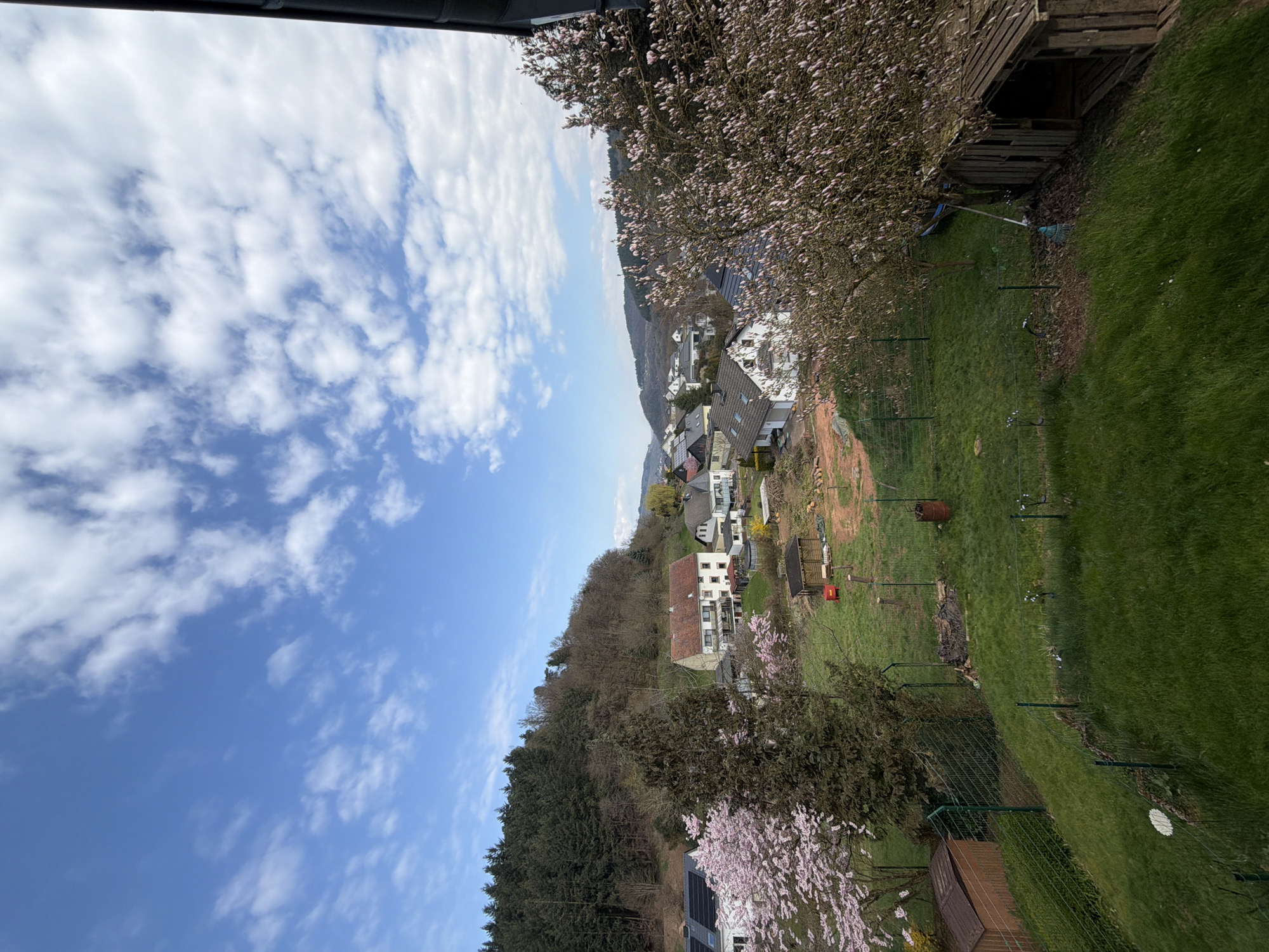 The image displays an elevated panoramic view of a residential area within a valley in Trassem, Germany, under a partly cloudy blue sky. The foreground consists of a well-maintained green grassy slope, segmented by dark green metal wire fences. On the left, a small, brown wooden shed with a dark roof is visible behind a fence. To the right, a weathered wooden lean-to structure, possibly an open shed, is partially observable, positioned adjacent to a deciduous tree adorned with numerous pink blossoms. A blue-handled garden tool is propped against the trunk of this blooming tree. Further into the foreground, within fenced plots, are patches of exposed soil, a dark red metal barrel, and a small pile of dark debris. The midground features multiple detached residential houses of varying architectural styles, several equipped with roof-mounted solar panels. A prominent dark green coniferous tree stands left of the center. Other trees in the midground are in bloom, displaying pink or white blossoms, and a yellow flowering shrub is visible near one of the houses. The background is dominated by forested hillsides, with dense coniferous growth on the left side of the valley and a mix of evergreen and bare deciduous trees extending into the distance on the right, defining the valley's contours. No individuals or active engagements are present within the depicted scene.