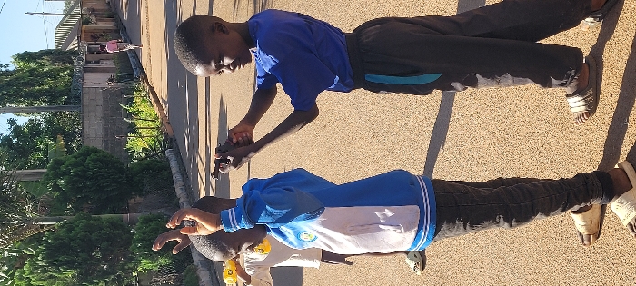 Two young boys are playing outdoors on a paved surface. One boy, wearing a blue shirt, appears to be holding a small item and examining it. The other boy, also in blue with a white stripe, has a yellow object in his hand. Both are dressed casually in dark pants and sandals. The background includes trees, greenery, and a building, suggesting a residential or park setting. The scene is brightly lit, casting shadows across the pavement.