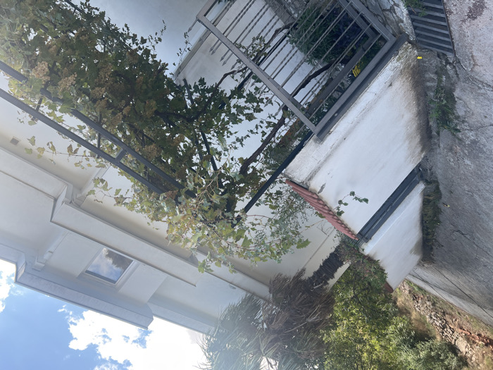The image depicts an outdoor residential scene in Čučuci, Montenegro, under a clear, bright sky with scattered white clouds. The primary focus is a modern, white-stucco building with a light grey roofline and one visible rectangular window, situated towards the upper right. In the mid-ground, a white retaining wall with reddish-brown terracotta tile coping runs horizontally, partially obscured by a dark metal fence or gate. A vibrant grape arbor with green leaves and clusters of light-colored, ripe grapes extends over this fence, forming a canopy. To the left, a sloped concrete surface, likely a road or pathway, runs diagonally from the bottom-left corner towards the upper-left. A metal storm drain grate is visible in the bottom-left corner of this concrete surface, with some weeds growing along its edge. A steep, rocky hillside covered in dense green foliage, including a palm tree, rises in the upper-left background. No individuals or active interactions are present in the scene.