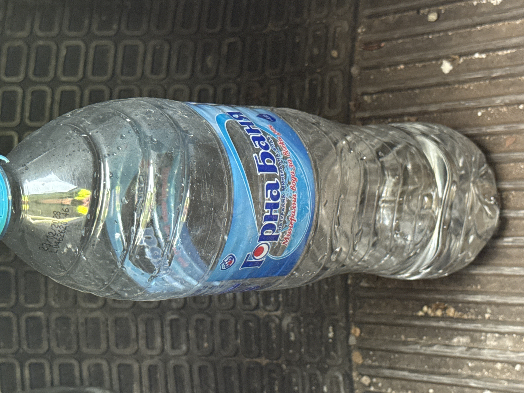 A plastic water bottle, approximately three-quarters full of clear liquid, stands upright on a dark gray, textured rubber mat. The bottle features a light blue screw cap and a prominent blue label bearing the brand name "Горна Баня" (Gorna Banya) in white Cyrillic script, identifying it as natural mineral water sourced from Gorna Banya, a district in Sofia, Bulgaria. Subordinate text on the label specifies "НАТУРАЛНА МИНЕРАЛНА ВОДА" (Natural Mineral Water) and "Минерална вода за всеки ден" (Mineral water for every day). Condensation droplets are visible on the bottle's exterior. Near the top shoulder, a printed date "23/02/2023" and lot number "L0462620 46" are discernible. The rubber mat exhibits a repeating pattern of raised, elongated rectangular cells and appears soiled with light-colored debris and dust particles. The scene is illuminated from above, creating reflections on the bottle's surface.