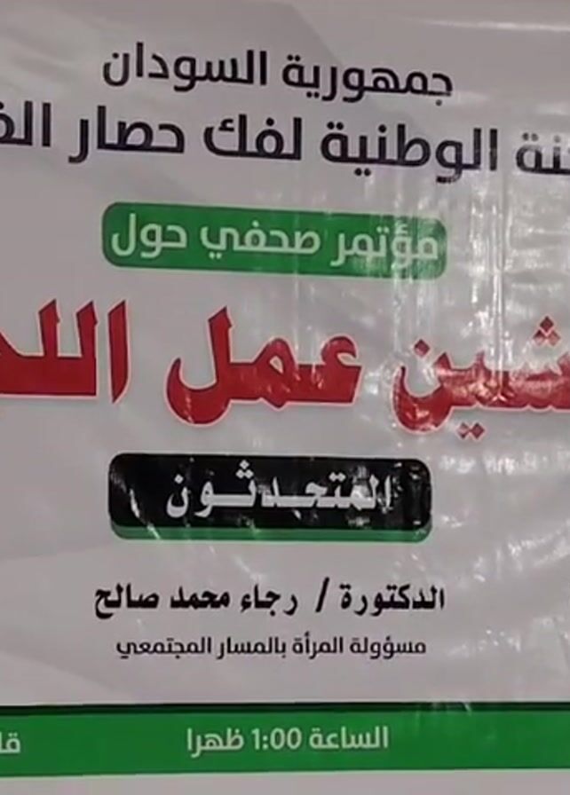 banner in Arabic. The banner reads, in Arabic, "The National Committee to Lift the Siege of El Fasher" and underneath it "Press Conference on the Launch of the Committee's Work". The banner lists the speakers as "Dr. Bahr Idris Abugarda, Deputy Head of the National Committee to Lift the Siege of El Fasher", "Dr. Raja Mohammed Saleh, Responsible for Women in the Social Track", and "Al-Makk Dakeen, Head of the Social and Cultural Track and Director of Police in the Red Sea State, Port Sudan." The date is listed as Thursday, September 18, 2025, at 1:00 PM.