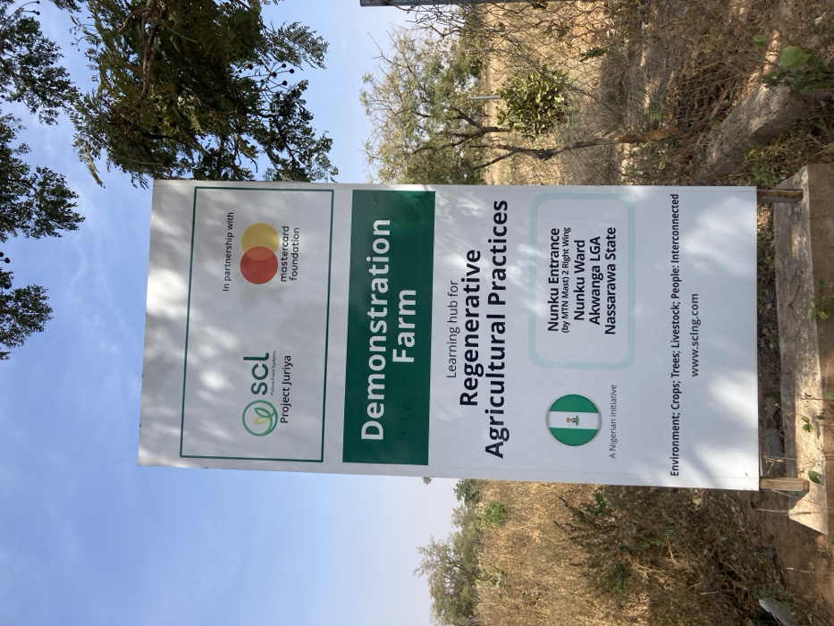 A white rectangular sign stands upright in an outdoor, semi-arid environment under a clear blue sky. The sign advertises a "Demonstration Farm" as a "Learning hub for Regenerative Agricultural Practices," in partnership with "SCL Project Juriya" and "mastercard foundation." It states "A Nigerian initiative" and provides the location as "Nunku Entrance (by MTN Mast) 2 Right Wing, Nunku Ward, Akwanga LGA, Nassarawa State." The bottom of the sign reads "Environment; Crops; Trees; Livestock; People: Interconnected" and "www.sclng.com." Shadows from overhead tree foliage are cast upon the upper portion of the sign. The surrounding area consists of dry, yellowish-brown grass and sparse deciduous trees with some green leaves. The sign is supported by concrete blocks at its base. A metal fence post is partially visible on the right side of the frame. No individuals or specific actions are depicted in the scene.