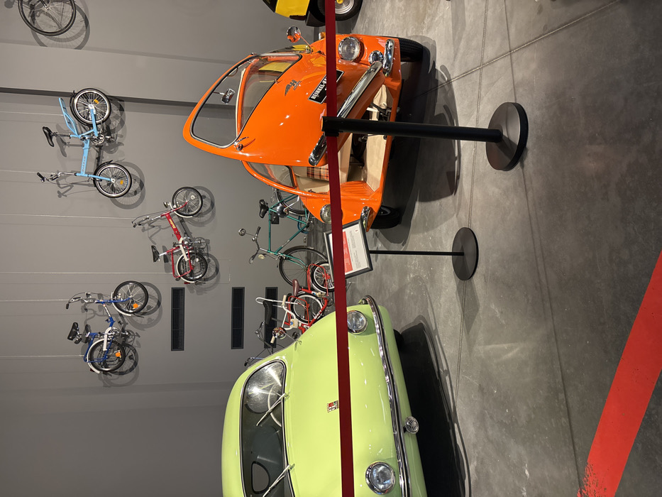 The scene depicts an indoor museum or exhibition space in Markovo, Bulgaria, showcasing a collection of vintage vehicles. The environment features dark gray walls and a light gray concrete floor. A red barrier rope, supported by black stanchions with circular bases, traverses the foreground, separating the viewer from the exhibits. On the left, a lime green vintage compact car is parked, displaying circular headlights, a chrome bumper, and windshield wipers. Its front is partially obscured by the barrier. To its right, an orange Heinkel Kabine microcar is prominently displayed with its entire front section, serving as the entry door, swung open to reveal a simple interior with plaid-patterned seats. This microcar also features circular headlights and a chrome bumper. A black-framed informational sign on a stand is positioned between the green and orange vehicles, behind the barrier. In the background, several vintage bicycles are displayed. Three folding bicycles (one blue and white, one light blue, one red and white) are suspended from the gray wall by thin wires. Below these, a red child's tricycle with white wheels is parked on the floor, alongside two adult vintage bicycles in a teal/green color scheme. Two horizontal rectangular ventilation grilles are visible on the gray wall. A partial view of a yellow vehicle is visible on the far right, adjacent to the orange microcar. No individuals are present in the image.