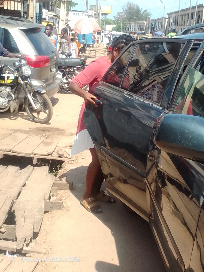 This image depicts an active urban street scene in Egbagu, Nigeria, under daylight conditions. In the foreground, a person with dark braided hair and dark skin, wearing a salmon-pink top with a white lower section and gold-colored sandals, is positioned next to a dark-colored sedan. The person's right hand grasps the handle of the partially open rear passenger door of the sedan, suggesting entry or exit. The sedan's side mirror is visible on the far right. Beneath the person's feet and extending to the left, a rudimentary wooden bridge or walkway, constructed from unpainted planks, spans an apparent ditch or gutter. The immediate ground is unpaved, dusty earth. In the midground, a silver SUV is parked or stopped behind the sedan. To its left, a dark motorcycle with yellow accents on its tank is parked, facing the viewer. Further back, another motorcycle is visible. Two individuals are discernible behind the SUV: a man in a light-colored shirt looking to the right, and a woman in a patterned dress standing nearby. The background shows a bustling commercial or market street. Various stalls are visible, some displaying clothing, with one shaded by a white parasol. Buildings, some appearing incomplete or in disrepair, line both sides of the street. A sign with "VILCON" is prominently displayed above a stall. The sky is clear, and strong shadows indicate direct sunlight.