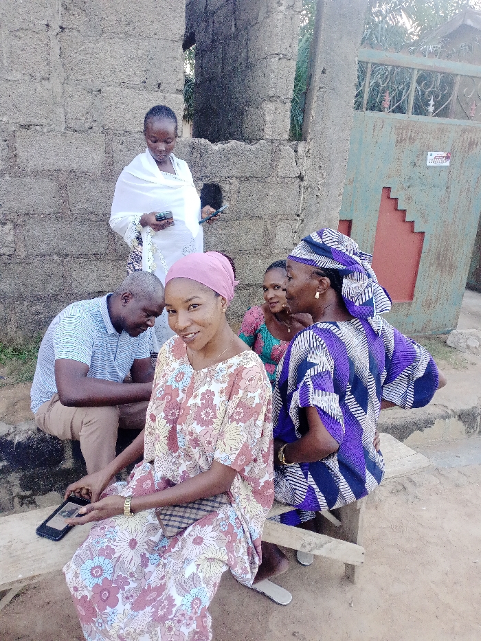 This image depicts an outdoor scene in Sabon Tasha, Nigeria, featuring five individuals
