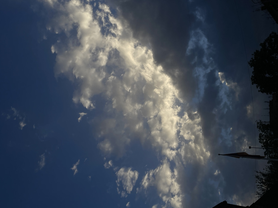The image displays an outdoor scene at either dawn or dusk in Yerevan, Armenia, dominated by a dynamic sky and a silhouetted urban foreground. The upper two-thirds of the frame feature a deep blue sky partially covered by a varied cloudscape. A prominent diagonal band of brightly illuminated white and golden-hued clouds extends from the upper right towards the mid-left, contrasting with surrounding darker grey and deep blue-grey clouds. A faint crescent moon is visible in the upper-mid-left quadrant, below the brighter clouds. The lower third of the image presents a dark silhouette of an urban environment. On the left, a tall flagpole is visible, flying a flag with red and orange/apricot bands, consistent with the Armenian national flag, unfurled to the right. Silhouetted canopies of trees are visible on both the left and right sides of the lower frame. Dark outlines of building rooftops and multiple antenna structures are faintly discernible along the horizon, primarily on the right. A thin, dark horizontal line, likely a utility cable, traverses the lower mid-section of the sky. No individuals or specific actions are discernible within the frame.