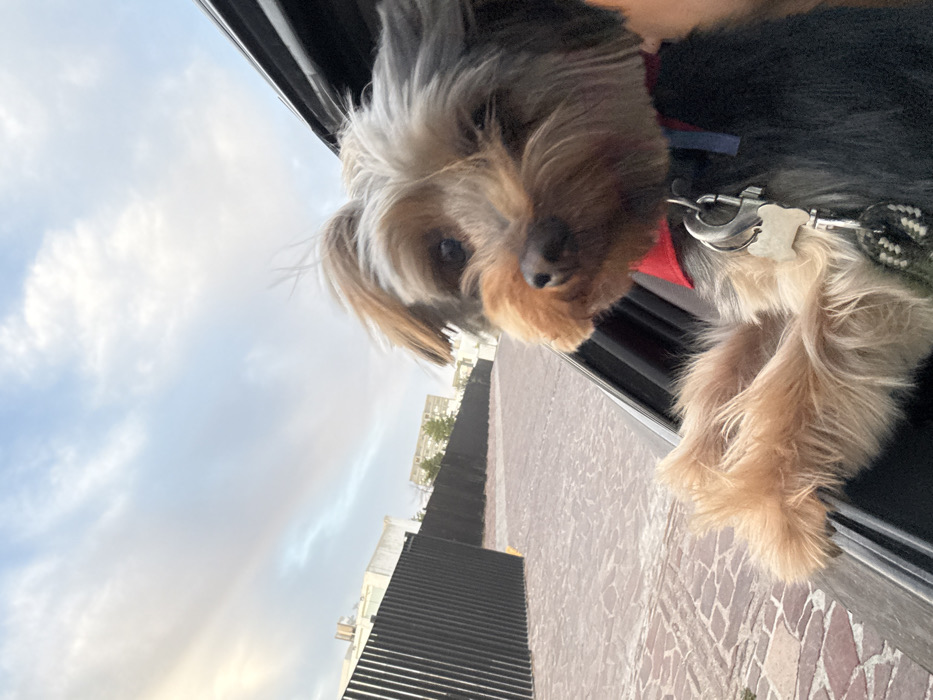 - "A Yorkshire Terrier dog, displaying bi-color tan and dark gray fur with wind-swept hair, is positioned with its head and front paws extending outside a dark vehicle's window frame" by FM-ZjnhV2, licensed under CC BY 4.0
