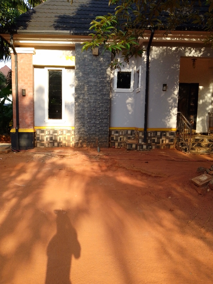 A single-story house with a dark roof and light-colored walls features a mix of brick and stone accents. A tall, narrow window sits beside a stone column. Decorative tiling lines the base of the building. A covered porch with a dark door is to the right. The foreground shows a dirt yard with shadows of trees and a person.