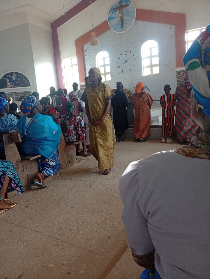 Inside a church, several people are gathered, many wearing traditional African clothing and headwraps. A woman in a gold dress walks toward the camera. Sunlight streams through arched windows behind the altar, where a crucifix hangs. A clock-like design decorates the wall below the crucifix. People are seated on wooden benches, and some stand near the front of the church.