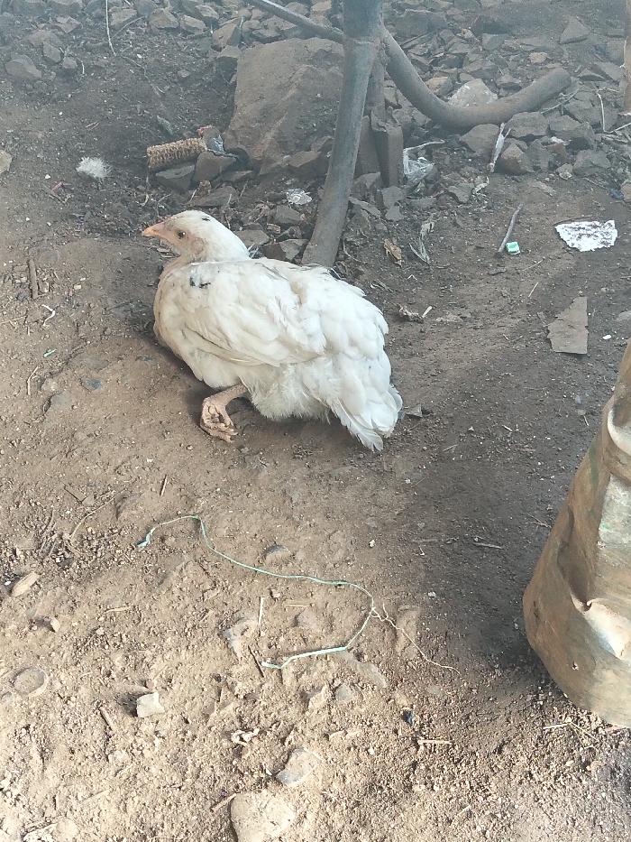 A white chicken rests on the ground in a cluttered outdoor space. The ground is covered in dirt, rocks, and debris, including a thin, green string. Metal poles and other objects are scattered around the chicken. The chicken appears calm and relaxed.