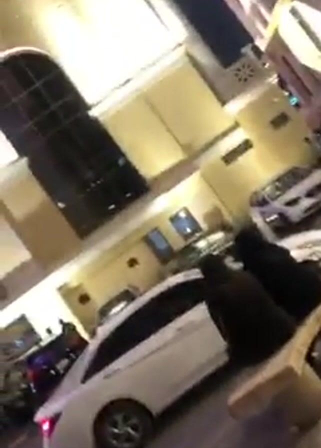 street at night. There are cars parked along the street, and buildings are visible in the background. The street is paved with bricks. The camera is shaky and moves around. The lighting is dim, with streetlights providing illumination.