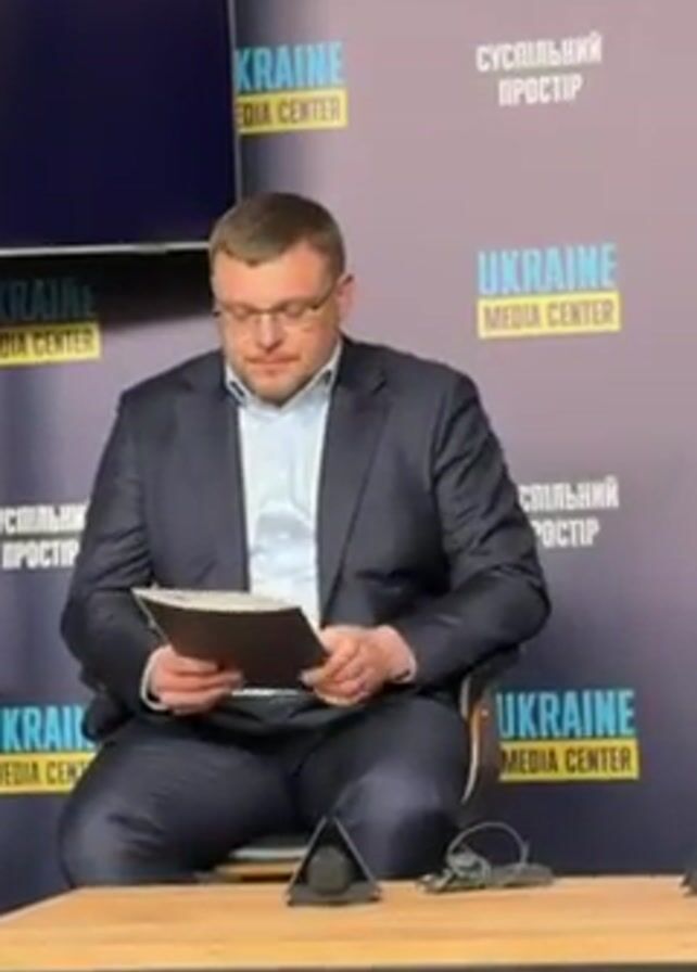 man in a dark suit and glasses seated at a wooden table in front of a backdrop with "Ukraine Media Center" printed on it
