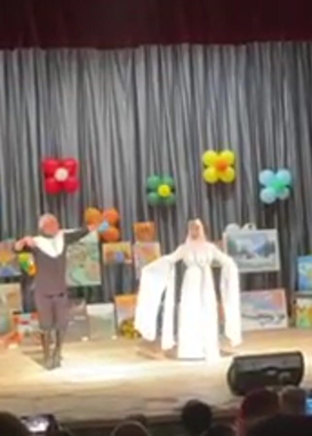 On a stage with a dark curtain backdrop adorned with colorful flower-shaped balloons, two figures are performing