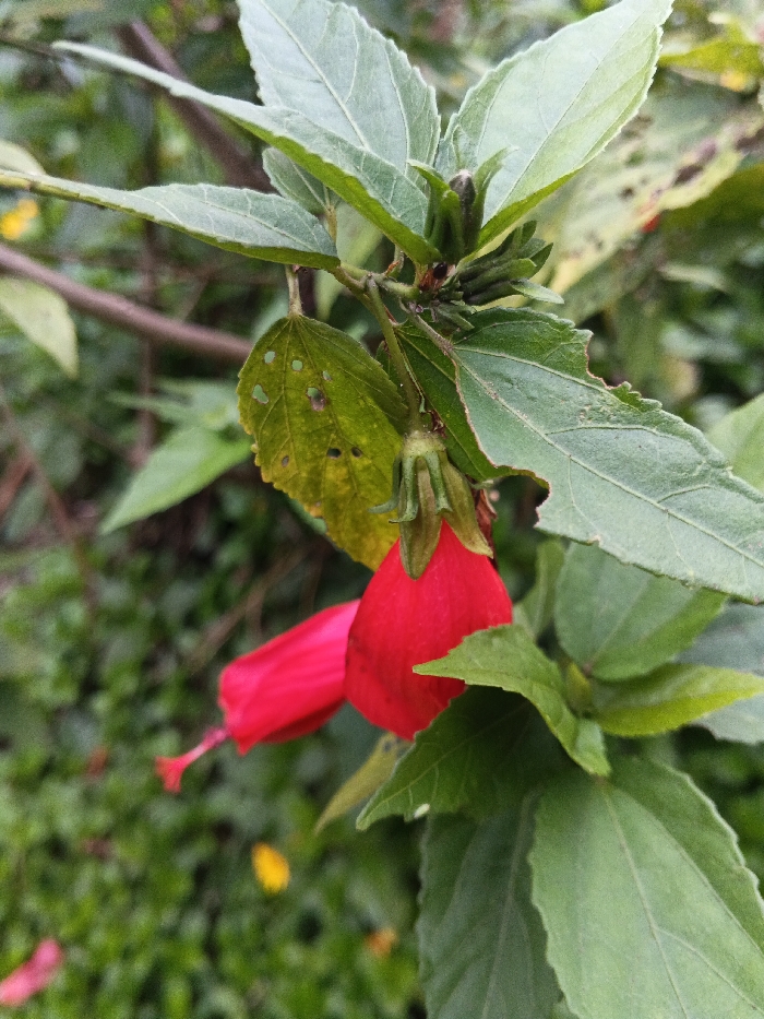 The image displays a close-up, vertical composition of a plant branch with foliage and flowers, situated in Moe Gyoe, Myanmar. The primary subjects are two vibrant red, downward-pointing flowers, each appearing tubular or bell-shaped. The flower on the left exhibits a slender, red pistil extending from its center. Numerous green leaves with visible venation surround the flowers, some exhibiting minor damage such as small holes and irregular edges. Several tightly closed green flower buds are also present on the branch. The background consists of heavily blurred green foliage, suggesting an outdoor natural environment. No people, objects other than the plant, or specific actions/interactions are depicted.