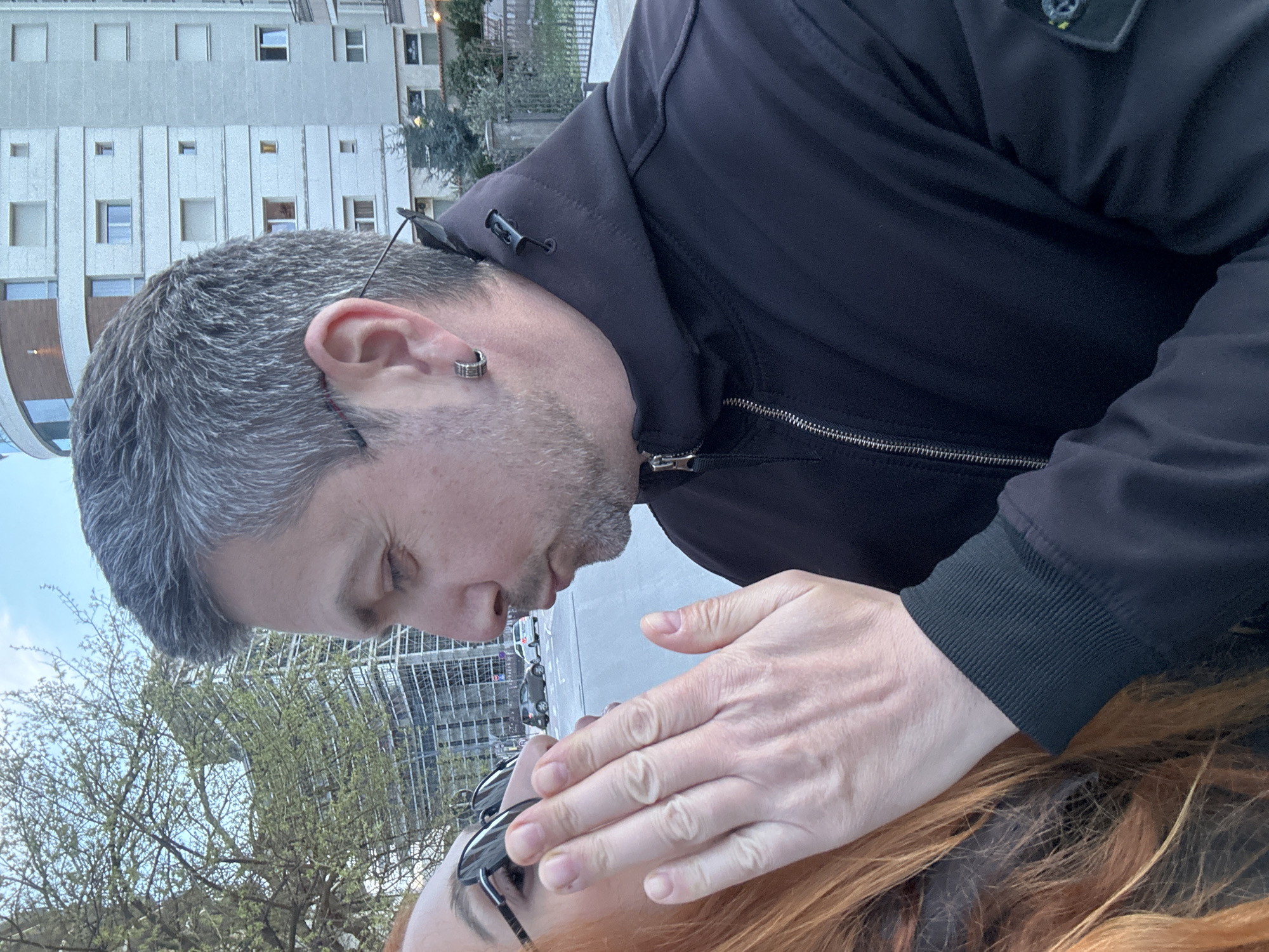 A man and a woman are face to face, intimately close. The man, with graying hair and stubble, wears an earring and a dark jacket. His hand is gently placed on the woman's face. The woman has red hair and is wearing glasses. They appear to be outdoors in an urban area. In the background is a multistory building and trees with budding leaves. The location is in Budva, Montenegro.