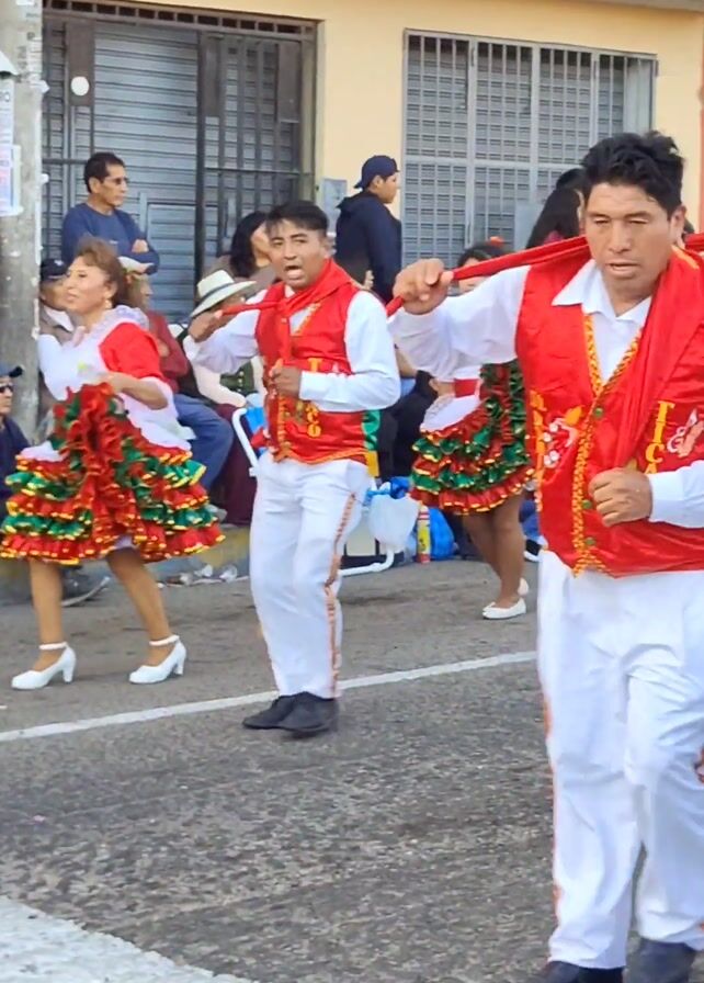 A street parade is taking place. Performers dressed in traditional Peruvian clothing are dancing and singing along the street. The women wear white and red blouses, white aprons, and large ruffled skirts in red, green, and yellow. The men wear white pants and shirts with red vests that have the word “Ticaco” stitched on them. Spectators watch the parade from the sidewalks and windows of buildings.