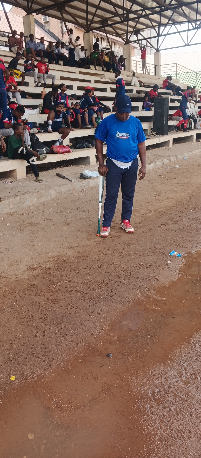 An outdoor scene depicts a sports field and concrete bleachers under a metal-framed canopy in Lagos, Nigeria. In the foreground, an adult male with a dark complexion stands facing slightly right, wearing a blue baseball cap, a blue t-shirt with "SOFTBALL NIGERIA" text, dark blue athletic pants, and red and white sneakers. A white undershirt is visible below his blue t-shirt. He holds a white and green baseball or softball bat vertically, resting its end on the muddy, reddish-brown ground, which shows numerous footprints and several puddles. To the left, on the lower concrete bleacher, another baseball bat lies horizontally. A large black speaker box is positioned on the ground near the bleachers on the right. In the background, numerous individuals, including children and adults, are seated or standing on the multi-tiered concrete bleachers. Many are wearing various sports attire, including red, blue, and green shirts. One person in the upper bleachers stands with arms raised. Behind the bleachers, an older building structure with windows is visible, and beyond the canopy, a light sky is seen. Debris, including a plastic wrapper and a bottle cap, are visible on the muddy ground.