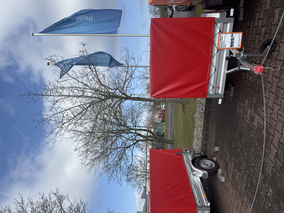The image displays an outdoor retail display area under a partially cloudy sky, located in the retail park on Marburger Straße in Gießen, Germany, near an OBI hardware store and a BMW dealership. In the foreground, two identical single-axle utility trailers with silver metal frames are parked on a dark grey paver-stone surface. Each trailer is fitted with a bright red, taut canvas cover. The trailer positioned to the right features a white price tag attached to its A-frame, displaying "999,99" Euros, preceded by the German text "Anhänger ungebremst Verdeck Set Sirius" (unbraked trailer canopy set Sirius). Small grey concrete blocks are visible on the ground near the wheels of the left trailer, serving as chocks or display stands. A silver chain stretches horizontally across the lower foreground, demarcating the display space. The midground features several bare deciduous trees with dark, visible branches, indicating winter or early spring foliage conditions. Behind these trees, a paved road is visible. To the right of the trees, two tall flagpoles rise. The left flagpole holds a blue flag with white lettering, partially displaying "BMW", identifying a nearby BMW dealership. The right flagpole displays a blue flag with white lettering that reads "muim" (mixim spelled backward), a characteristic branding element for an OBI hardware store. In the background, across the road, commercial buildings are present. These include a structure with a yellow-accented facade on the left and a red-roofed or red-sided building further to the right. Multiple vehicles, including a red car, are visible on the road and in distant parking areas. The sky is partially covered by white clouds, with patches of clear blue visible. No individuals are present in the scene.