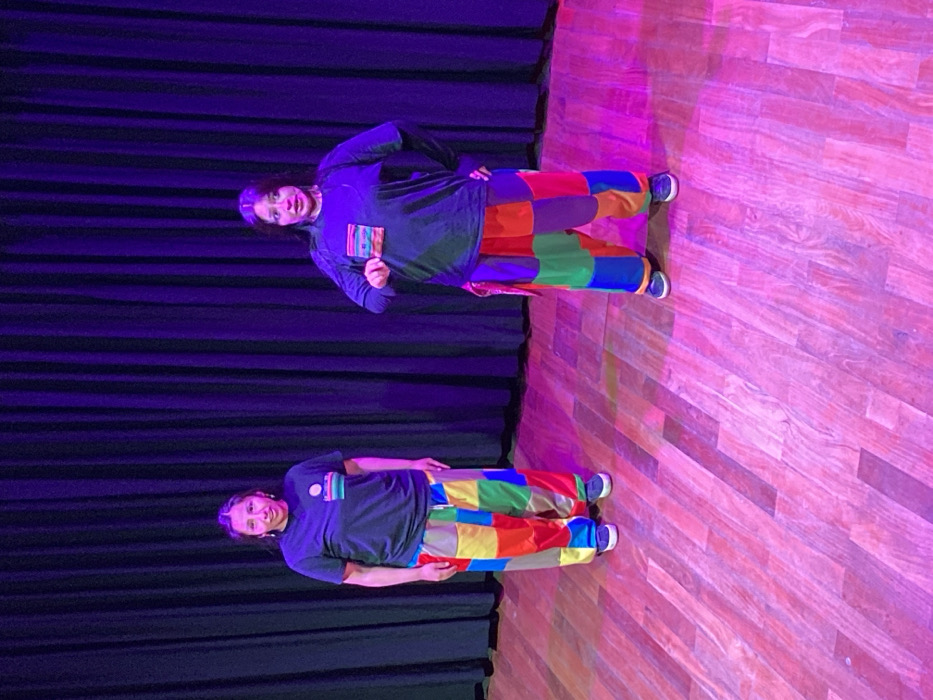 This image captures two adult females on a stage within an unidentified indoor performance venue located in the city of El Alto, Bolivia. The stage features a light-colored wooden floor, reflecting a dominant purple stage illumination, and is backed by dark, vertically pleated curtains. The female on the left stands facing forward. She is attired in a dark blue short-sleeved t-shirt with a circular multicolored emblem on the left chest, and multicolored patchwork pants composed of square fabric panels in red, yellow, green, blue, purple, and orange hues. She wears dark blue sneakers with white soles. Her hair is dark and styled away from her face, and she exhibits a slight smile. The female on the right also stands facing forward. She wears a dark blue long-sleeved shirt beneath a dark blue short-sleeved t-shirt, which displays a rectangular multicolored patch on the left chest. Her lower attire consists of multicolored patchwork pants, visually identical in pattern and color composition to those of the other individual. She wears dark blue sneakers with white soles. A multicolored fabric piece is secured to her left hip. Her right arm is raised and bent at the elbow, with her hand positioned slightly forward, while her left hand rests on her hip. Her mouth is slightly agape.
