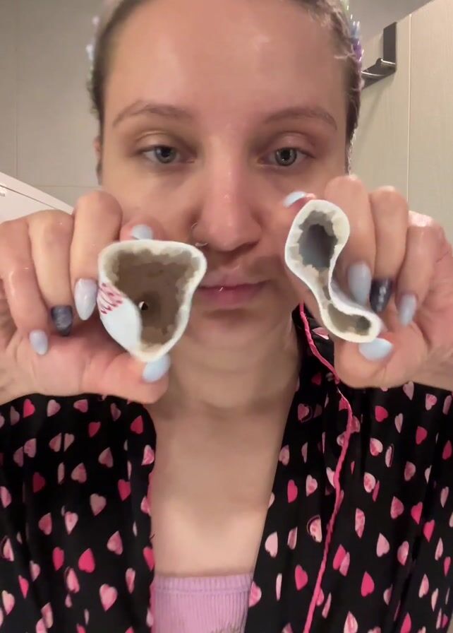 A young woman with light skin, fair hair, and a nose ring holds up two halves of a broken mug. She wears a headband of colorful beads, a pink tank top, and a black pajama top patterned with pink hearts. The woman displays the inside of the mug halves, which are stained a dark brown. She then displays a small white square with a red tear line that looks like a single-use product package. She puts a dab of cream on her face. The background is a white-tiled bathroom, a white washing machine is visible to the left.