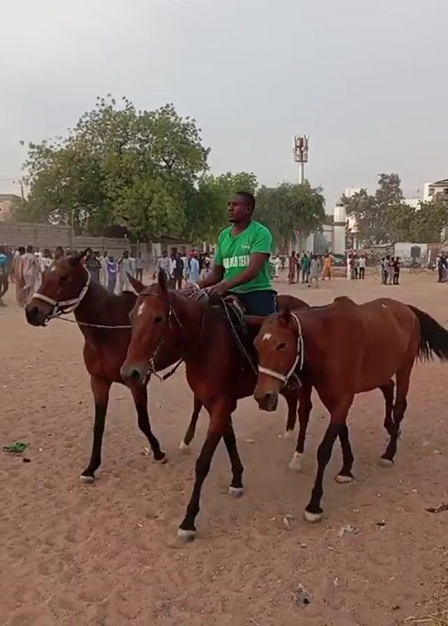 A medium shot captures a man riding one horse while leading two others through a sandy field. The horses are brown, with the lead horse being ridden. A crowd of people stands in the background, some wearing traditional clothing. The sky is overcast, and a few buildings and trees are visible in the distance. The camera follows the man and horses as they move across the field, with other people on horseback seen passing by in the background.