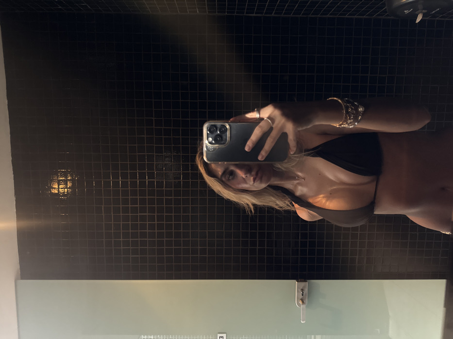 A woman in a dark bikini takes a selfie in a tiled bathroom. She holds her phone up, obscuring her face. She wears bracelets on her wrist. The bathroom has black tiled walls and a frosted glass partition with a handle. The light is muted and possibly artificial, reflecting off the tiles. Her blonde hair is tousled.