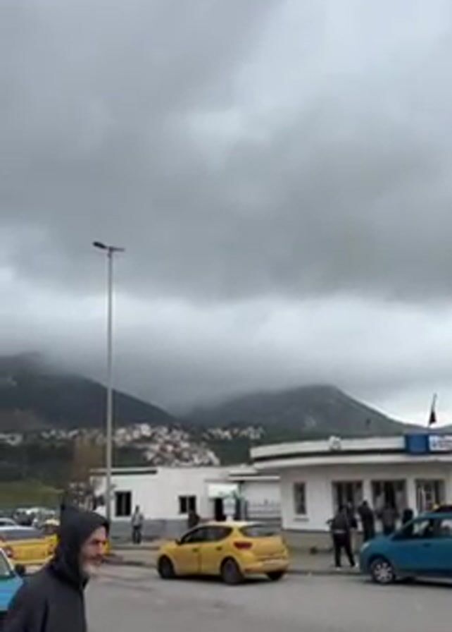 street scene with cars parked along the side. There are yellow taxis and a blue car. In the background are mountains shrouded in clouds. A few buildings are visible, including one that appears to be an office or station with people standing near the entrance. An older man in a dark hooded robe walks across the foreground, looking towards the camera. The sky is overcast and grey.