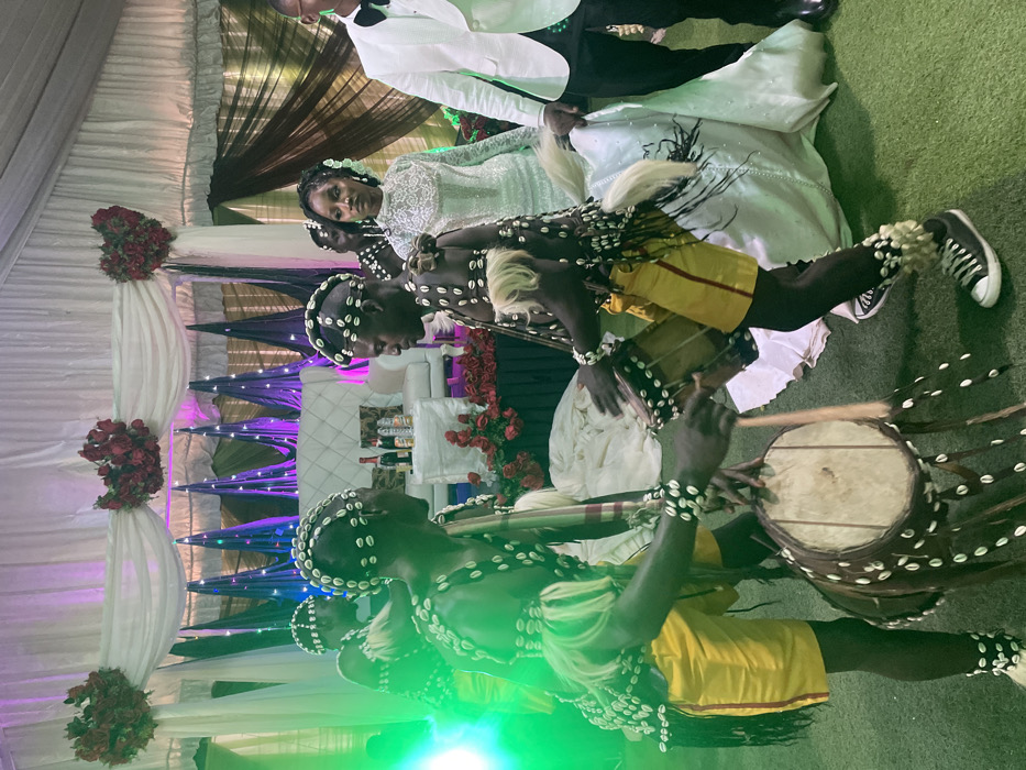A wedding celebration features a bride and groom in traditional attire, with the bride in a white gown and the groom in a white suit. Traditional African drummers, adorned with cowrie shells, provide entertainment at the event. The drummers wear yellow skirts, black leggings, and black and white sneakers. A stage is decorated with white draping, red rose arrangements, and ambient purple and green lighting.