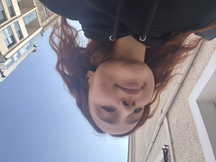 A young adult female, with reddish-brown, wavy hair, light skin, and a subtle smile, is depicted in a low-angle outdoor portrait. She wears a black hooded sweatshirt with white drawstrings and a small stud earring in her left ear. The bright blue, clear sky occupies a significant portion of the upper frame. To the left, a building with a light-colored, textured facade and a vertical downspout is visible. To the right, a multi-story, modern building with light-colored walls, glass-railed balconies, and reflective windows is present. A segment of an older, possibly brick, building is partially obscured behind the modern structure. The scene is located in the city of Reims, France, under bright daylight conditions.