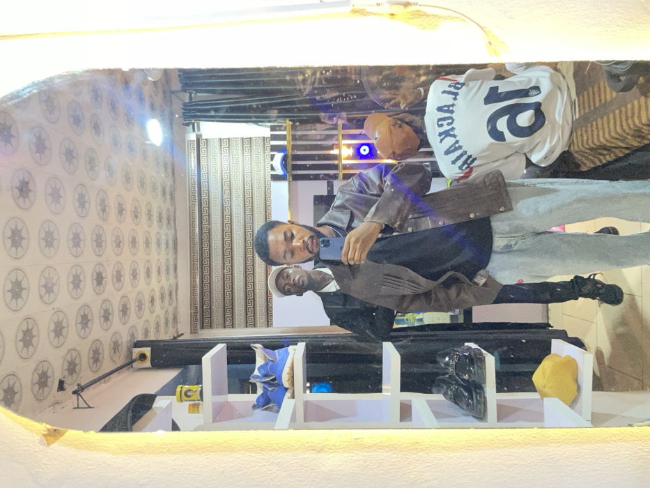 This image is a mirror selfie captured inside a retail establishment located in Idah, Nigeria. A male subject with a short beard, wearing a brown jacket over a dark t-shirt and light blue jeans, is visible centrally, holding a light blue smartphone to take the photograph. Reflected behind him is a second male, wearing a light-colored cap and a dark jacket. To the right, a third male is partially visible from the back, wearing a white jersey with "BLACK AIR" and "ar" printed on it, and an orange cap, with his right hand raised in a gesture. The interior environment includes a white multi-tiered shelving unit on the left, displaying items such as blue sneakers, black patent leather loafers, and a yellow object. The ceiling features patterned circular tiles, and a background wall exhibits a beige and dark-patterned Greek key (meander) design. Dark curtains and various light sources are also reflected within the scene.