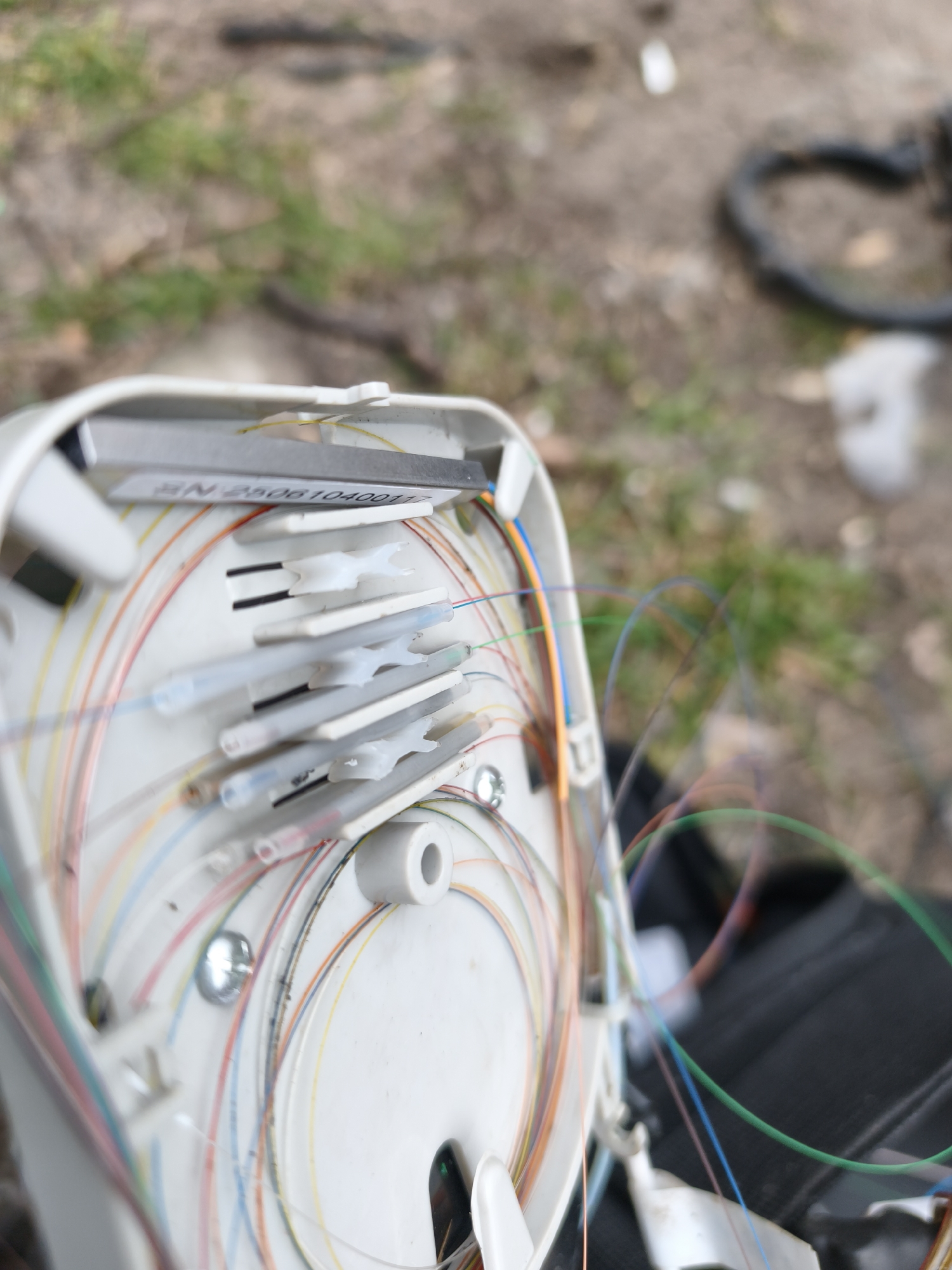 - "An open, white plastic fiber optic splice enclosure is centered in the foreground, revealing its internal components" by FM-sHkp03, licensed under CC BY 4.0