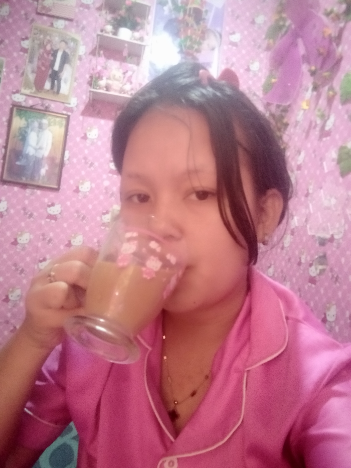 A close-up image depicts a young individual, likely female, with dark hair, drinking a light brown beverage from a clear glass mug adorned with pink Hello Kitty motifs. The individual wears a pink satin-like collared shirt, possibly pajamas, with white piping and white buttons, and a thin gold-colored necklace is visible. The background consists of a pink wall covered in white Hello Kitty wallpaper. On the wall, two framed photographs are visible: the upper frame shows a formally dressed couple, and the lower frame displays a couple in traditional attire. Above the lower frame, two small shelves hold decorative items. Partially visible in the upper right is a purple fabric decoration. The scene takes place indoors, within a residential setting in Cipinang, Indonesia.