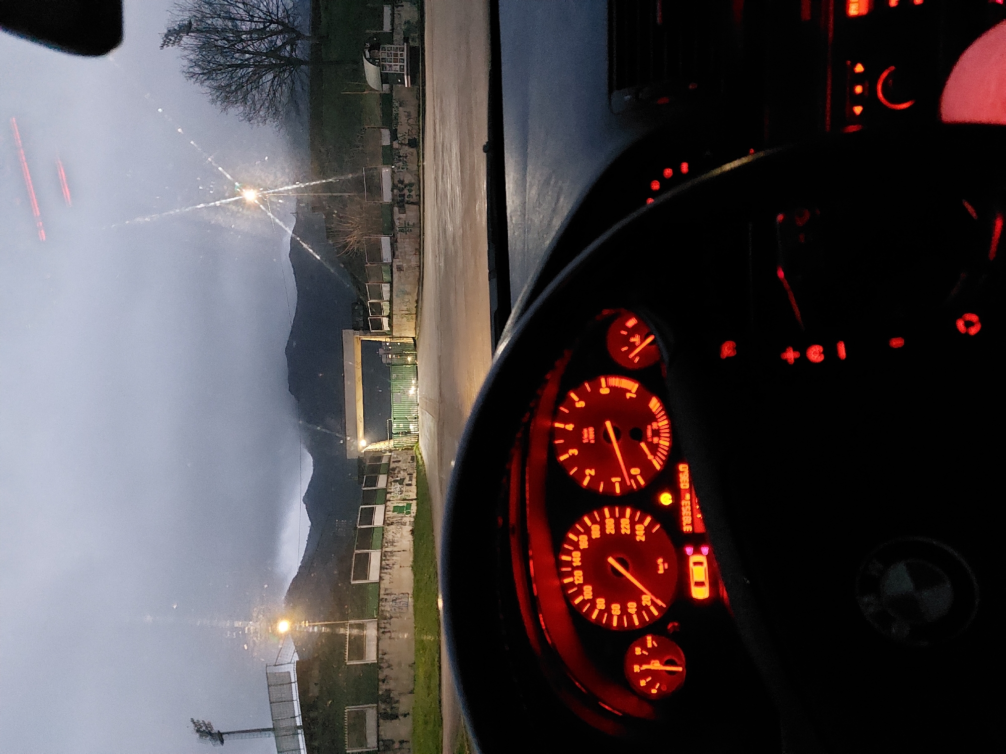 The image is a view from inside a car at night in Vratsa, Bulgaria. The dashboard is visible, with the speedometer illuminated in red. Outside the car, there is a road and some buildings with graffiti on them. In the distance, mountains can be seen through a cloudy sky. A street light is also visible.