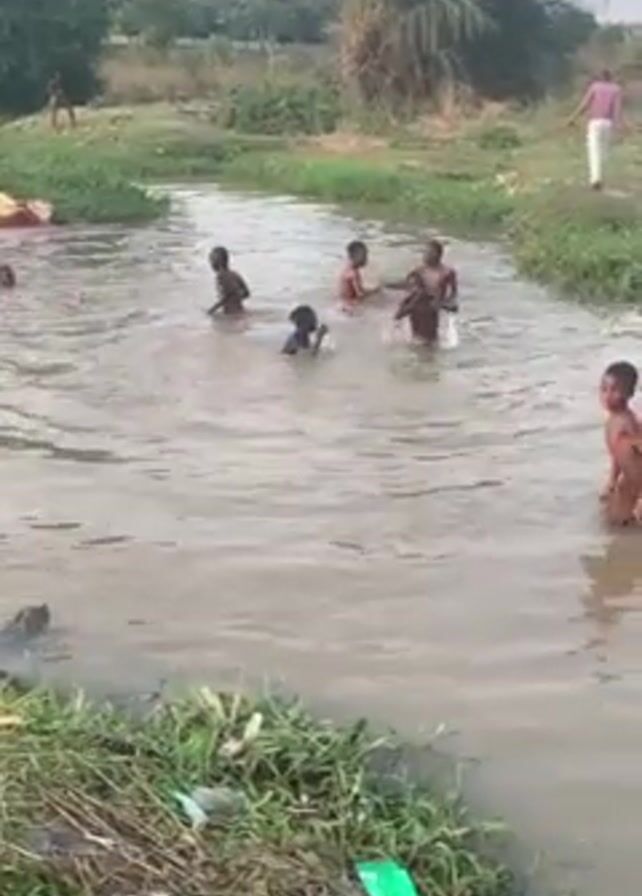 group of children playing in a muddy river. There are about seven children in the river, and they appear to be splashing around and having fun. The river is surrounded by green vegetation, and there are a few people standing on the riverbank watching the children. The video seems to be taken on a cloudy day.