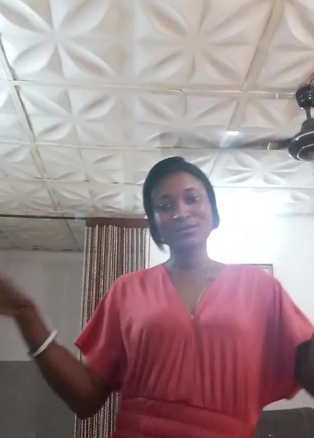 A woman is standing in front of the camera, she is smiling and starts dancing slowly. She is wearing a red dress with a V-neck. The sleeves are short, and the dress has an elastic waistband. She wears two gold bracelets, one on each wrist, and two gold rings. The room she is in has a white decorative ceiling, a brown curtain, and a framed logo on the wall that says “Rich Blackman.” A ceiling fan is turning above her. Music is playing.